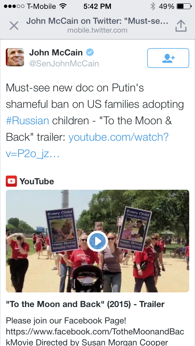 'A must see new documentary on Putin's shameful ban on U.S. families adopting Russian children"-Senator John McCain
